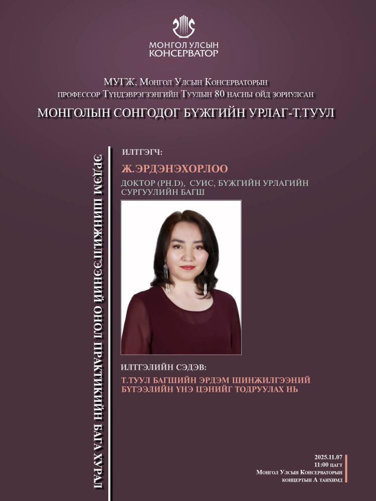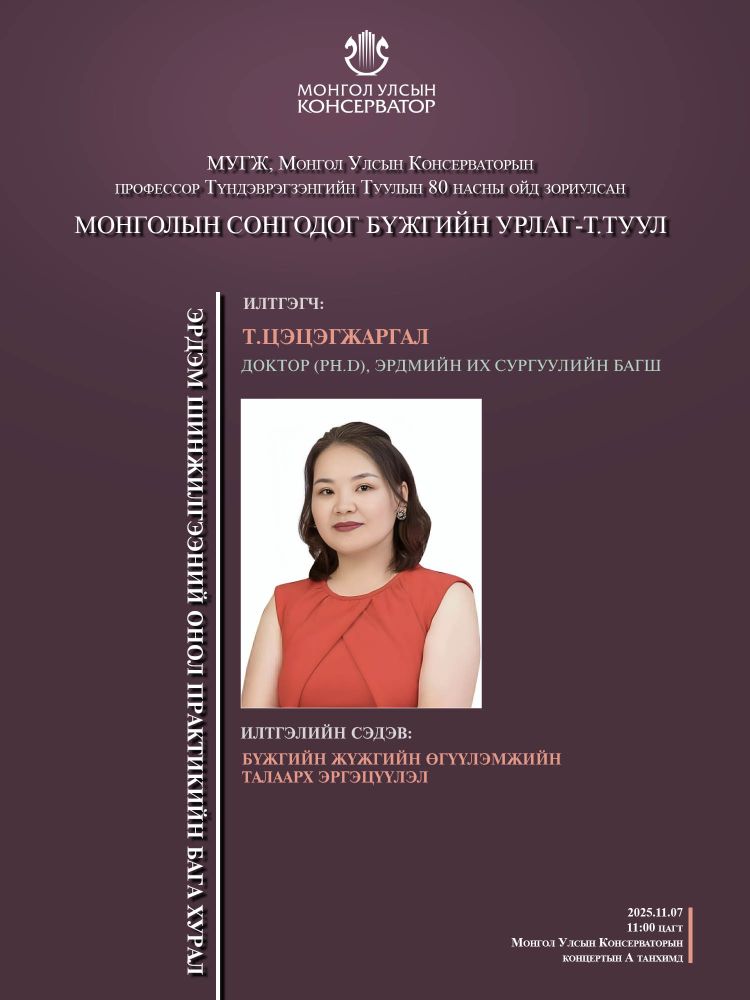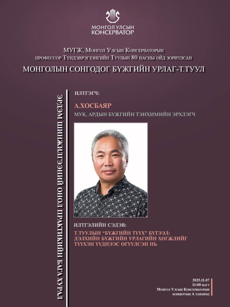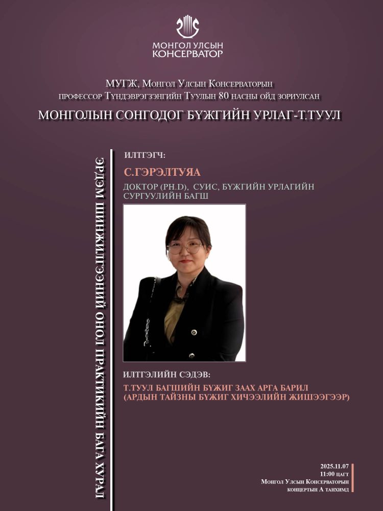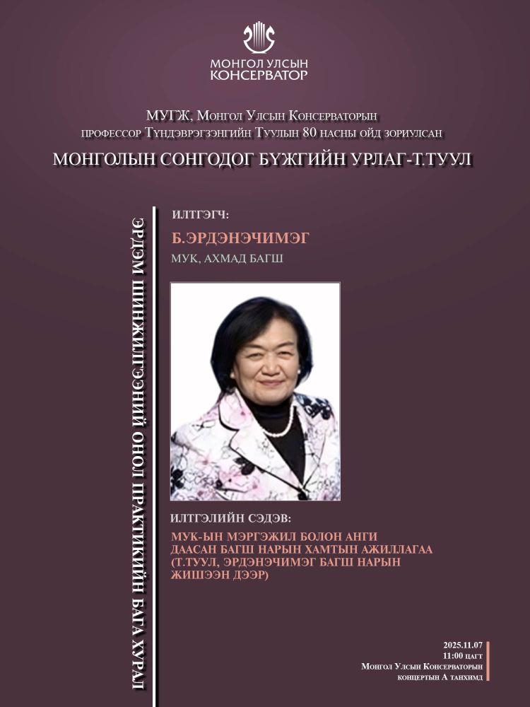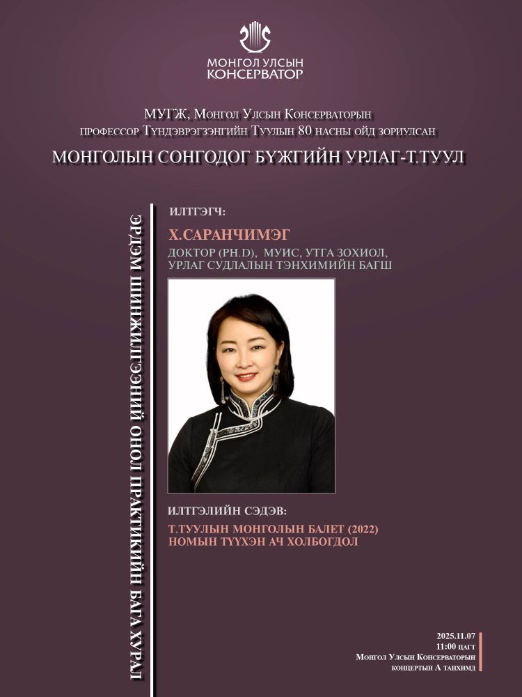 МУГЖ, Монгол Улсын Консерваторын профессор Т.Туулын 80 насны ойд зориулсан эрдэм шинжилгээний онол практикийн бага хуралд эрдэмтэн багш, оюутан сурагчид та бүхнийг хүрэлцэн ирэхийг урьж байна.