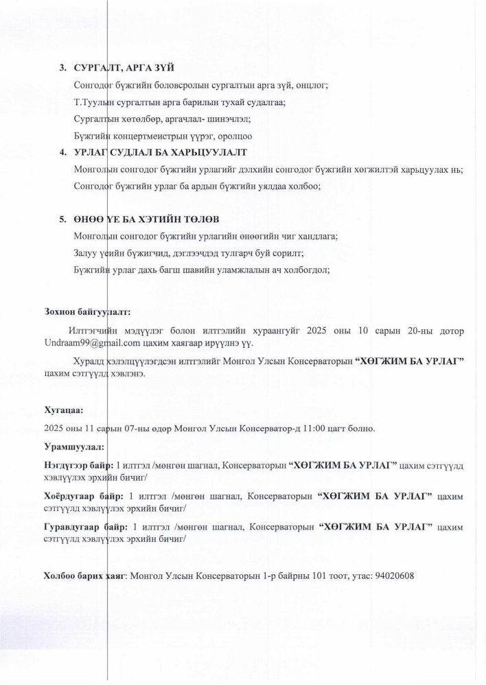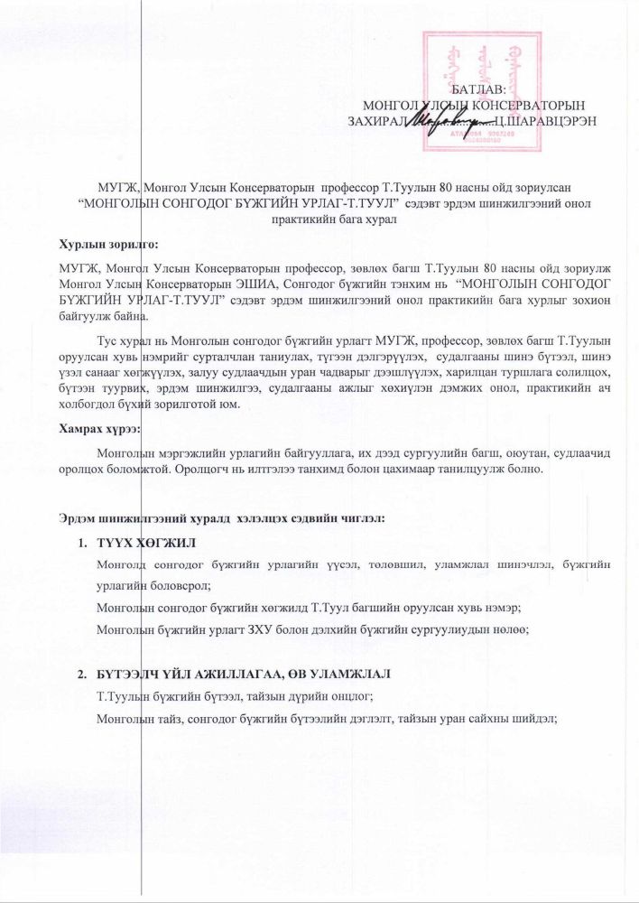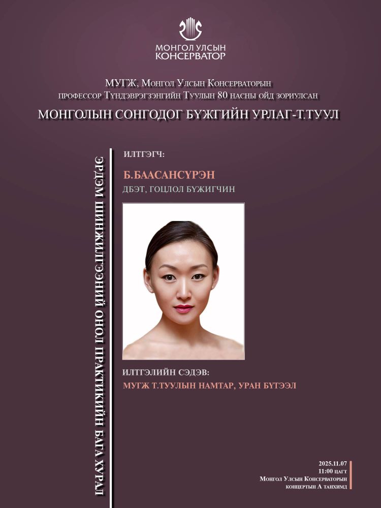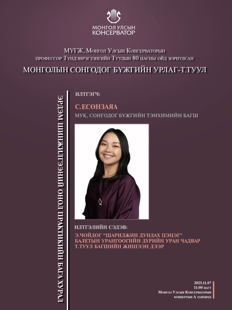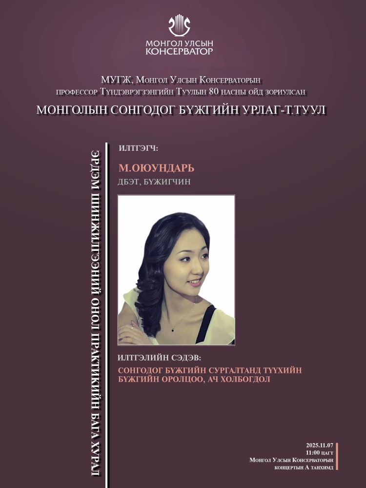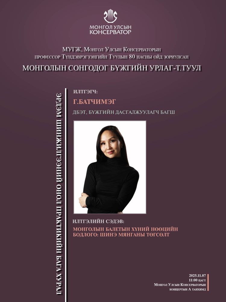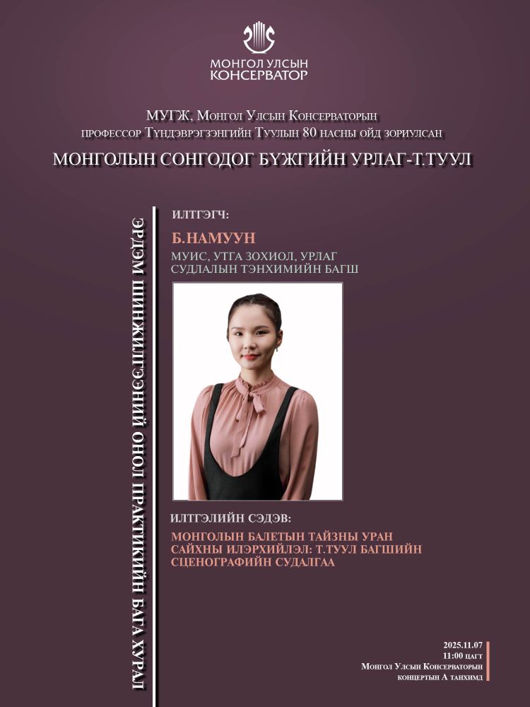 МУГЖ, Монгол Улсын Консерваторын профессор Т.Туулын 80 насны ойд зориулсан эрдэм шинжилгээний онол практикийн бага хуралд эрдэмтэн багш, оюутан сурагчид та бүхнийг хүрэлцэн ирэхийг урьж байна.