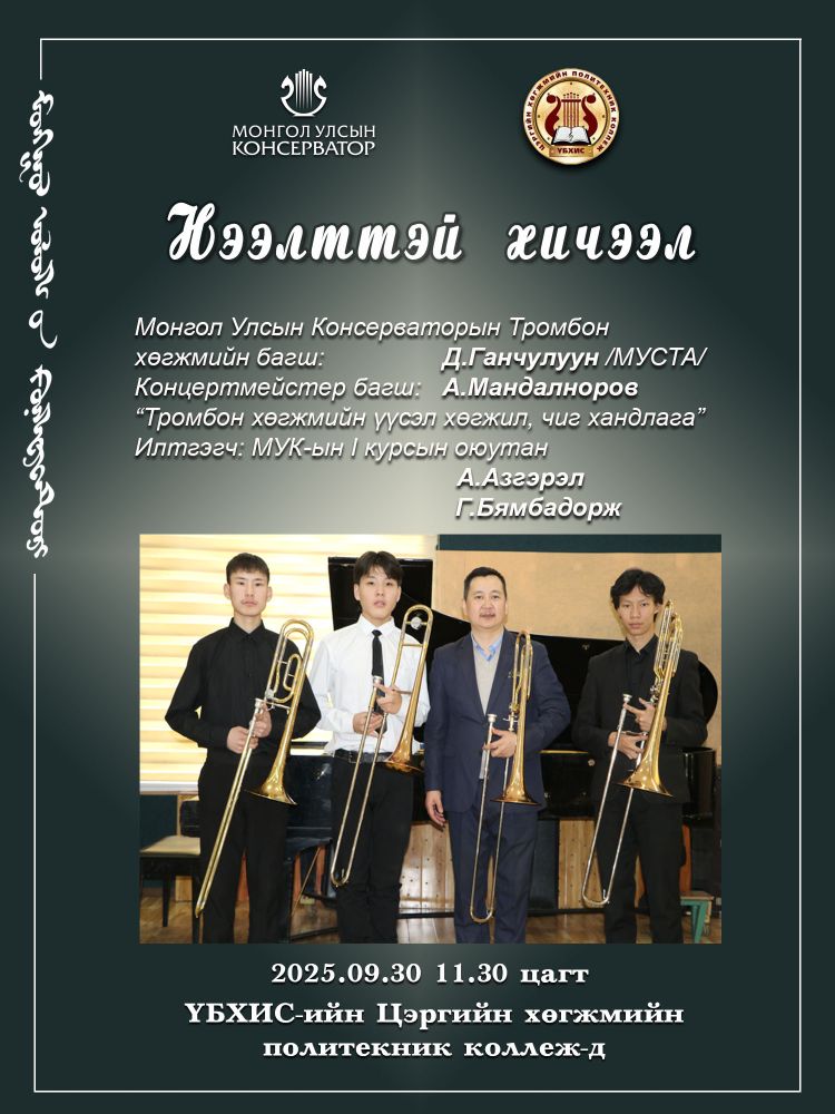 Монгол Улсын Консерваторын Тромбон хөгжмийн багш Д. Ганчулуун оюутнуудын хамт ҮБХИС-ийн ЦХПКоллежийн оюутан сурагчдад “Нээлттэй хичээл”-ийг 2025.09.30 өдөр орлоо.