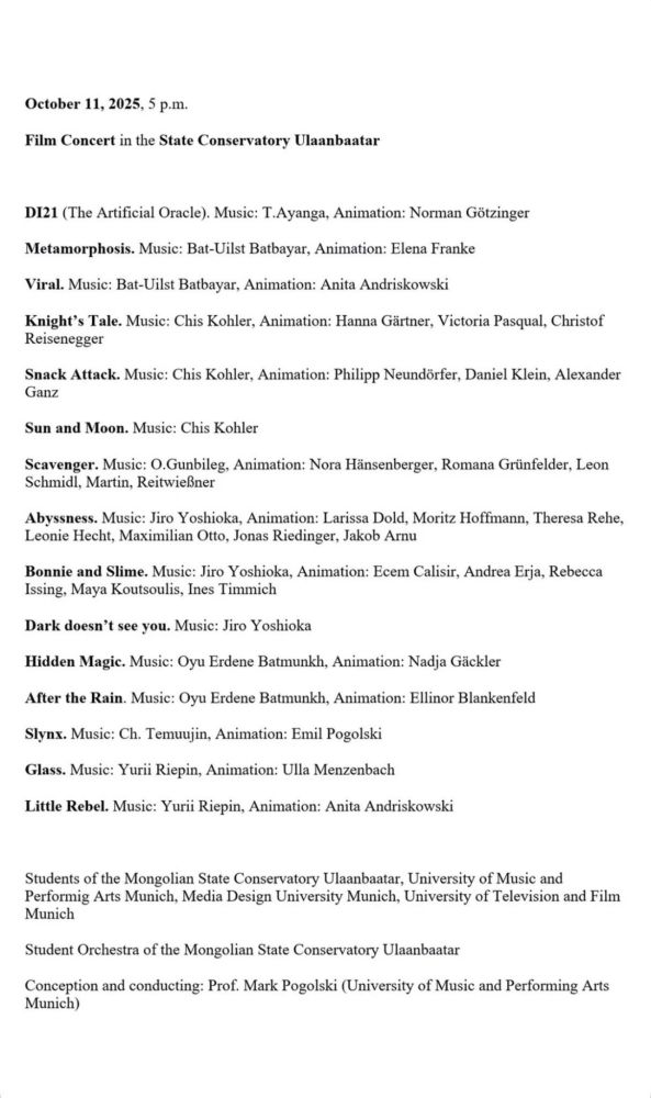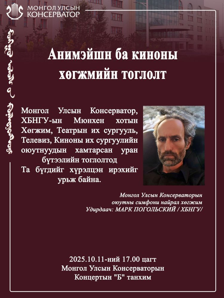 Энэ жилээс хэрэгжүүлж буй шинэ төслийн хүрээнд Монгол Улсын Консерваторын Хөгжмийн зохиомжийн ангийн оюутнууд болон ХБНГУ-ын Мюнхен хотын Хөгжим, Театрын Их Сургуулийн хөгжмийн зохиомжийн оюутнуудын уран бүтээлийн тоглолтод Та бүхнийг урьж байна.