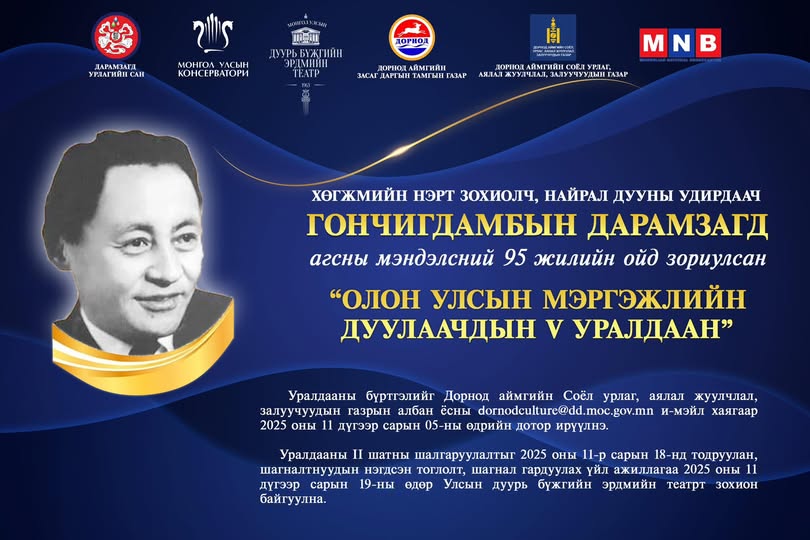 МОНГОЛЫН НЭРТ ХӨГЖМИЙН ЗОХИОЛЧ , НАЙРАЛ ДУУНЫ УДИРДААЧ ГОНЧИГДАМБЫН ДАРАМЗАГД АГСНЫ НЭРЭМЖИТ МЭРГЭЖЛИЙН ДУУЧДЫН ОЛОН УЛСЫН УРАЛДААН БОЛНО.