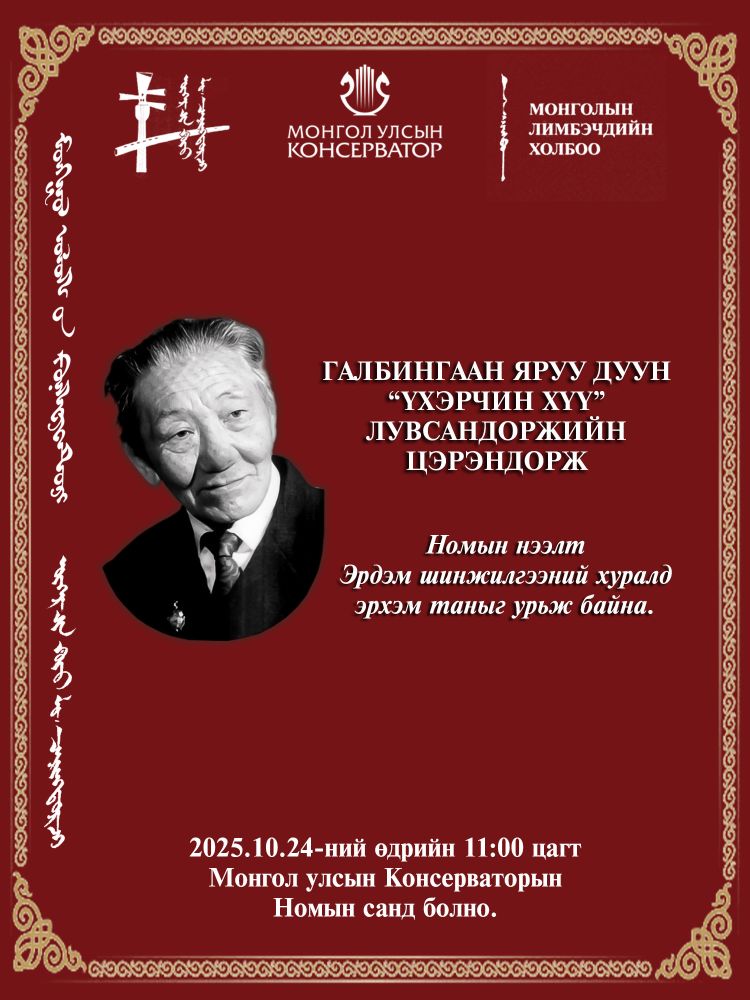 Монгол Улсын Консерваторын ахмад багш, алдарт, гавьяат жүжигчин Л.Цэрэндоржийн “Галбингаан яруу дуун” номын нээлтэнд хүрэлцэн ирэхийг урьж байна.