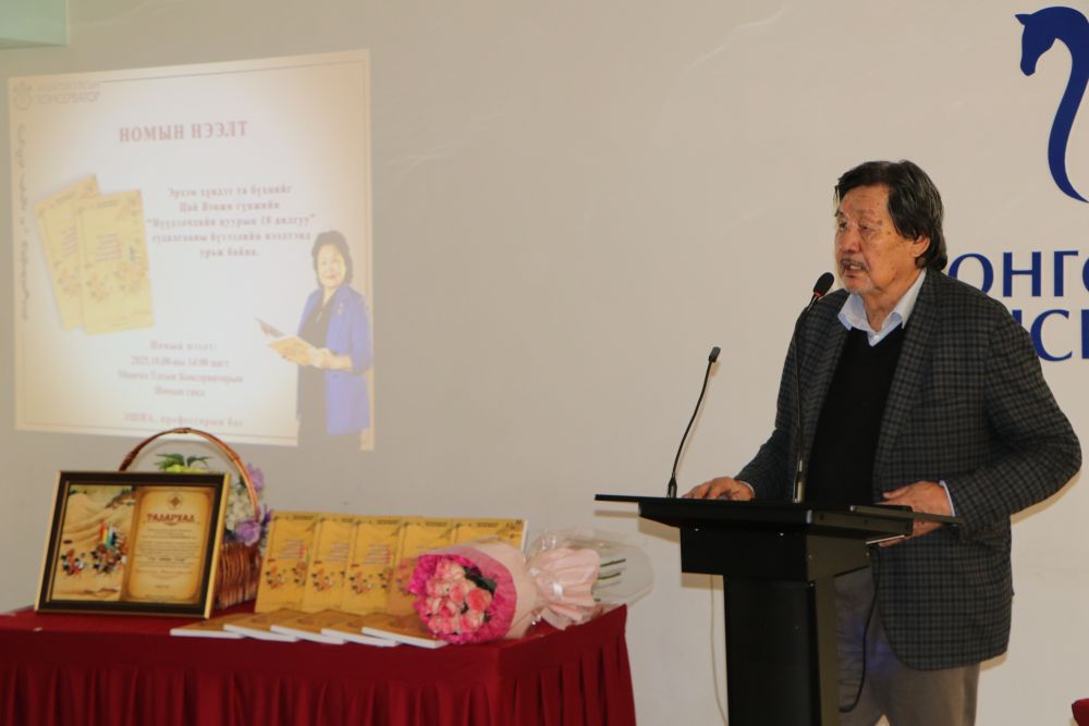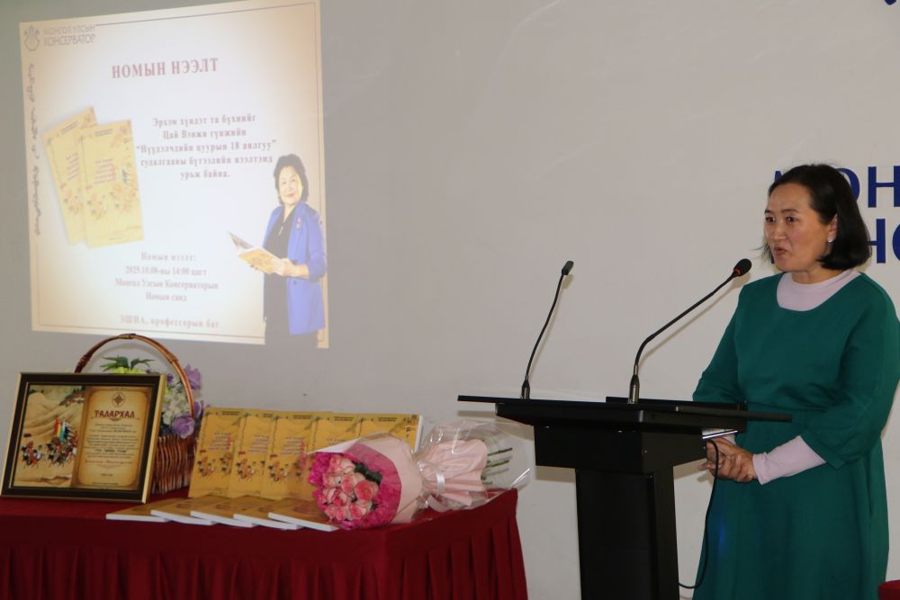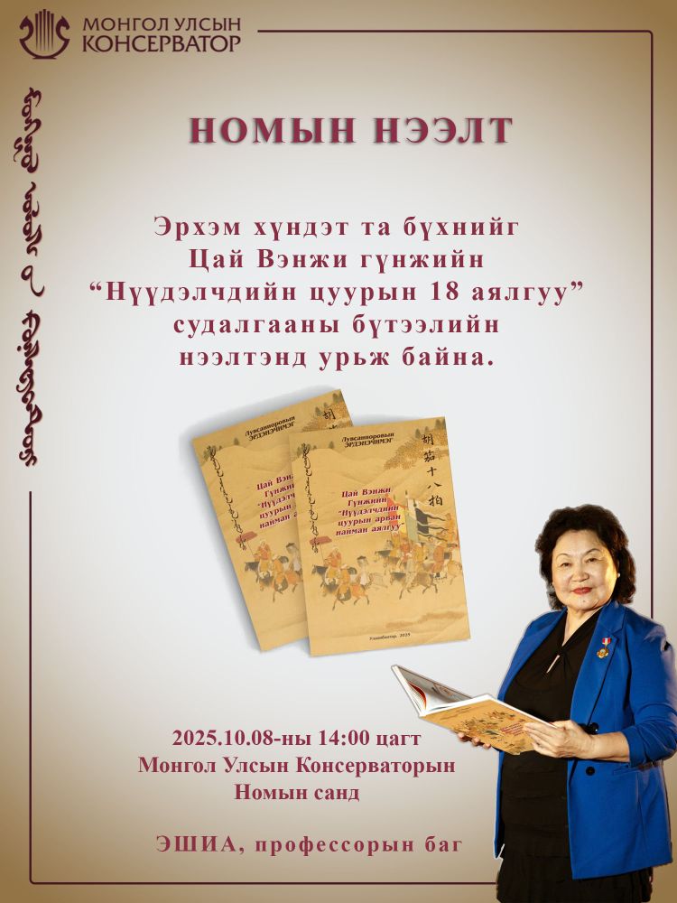 Монгол Улсын Урлагийн Гавьяат зүтгэлтэн, Шинжлэх ухааны доктор /Sc.D/, профессор Л.Эрдэнэчимэгийн Цай Вэнжи гүнжийн “Нүүдэлчдийн цуурын 18 аялгуу” судалгааны бүтээлийн нээлт 2025.10.08-ны 14:00 цагт Монгол Улсын Консерваторын Номын санд амжилттай болж өндөрлөлөө.