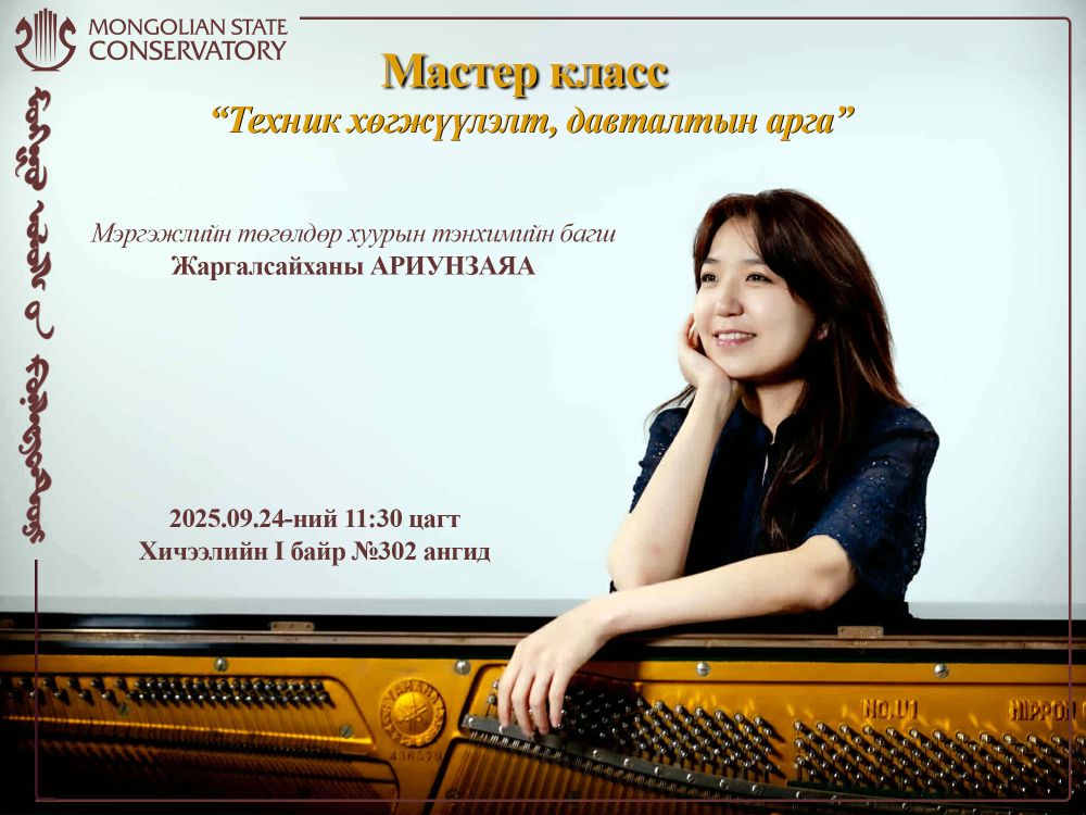 Мэргэжлийн төгөлдөр хурын тэнхимийн багш Ж.Ариунзаяагийн “Техник хөгжүүлэлт, давталтын арга” мастер класст урьж байна.