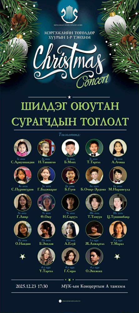 Монгол Улсын Консерваторын Мэргэжлийн төгөлдөр хуурын 1-р тэнхимийн шилдэг оюутан сурагчдын “Шинэ жилийн тоглолт”2025 оны 12-р сарын 23-нд амжилттай болж өнгөрлөө.