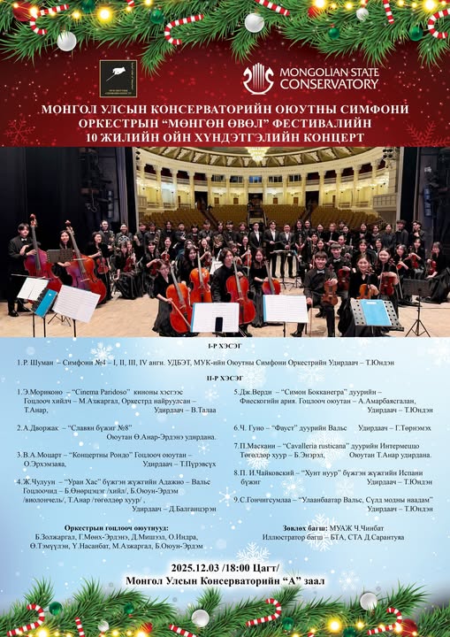 Монгол Улсын Консерваторын Оюутны Симфони Оркестрийн “Мөнгөн Өвөл” Фестивалийн 10 жилийн ойн хүндэтгэлийн тоглолтод хүрэлцэн ирэхийг урьж байна!