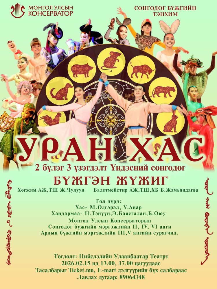 Ж.Чулуун “Уран Хас” балетын жүжгээ Гал Морин жилийн босгон дээр Нийслэлийн Улаанбаатар театрын тайзнаа хоёрхон удаа тоглох гэж байна. Та бүхэн хүрэлцэн ирж, Төрийн шагналт, Ардын жүжигчин Ж.Чулуун гуайн алдарт вальсийг сонсож, балетын жүжгээ хүүхдүүдийн маань уран тансаг хөдөлгөөнөөр амилуулан үзэж, сэтгэл оюуны таашаал авна гэдэгт найдаж байна.