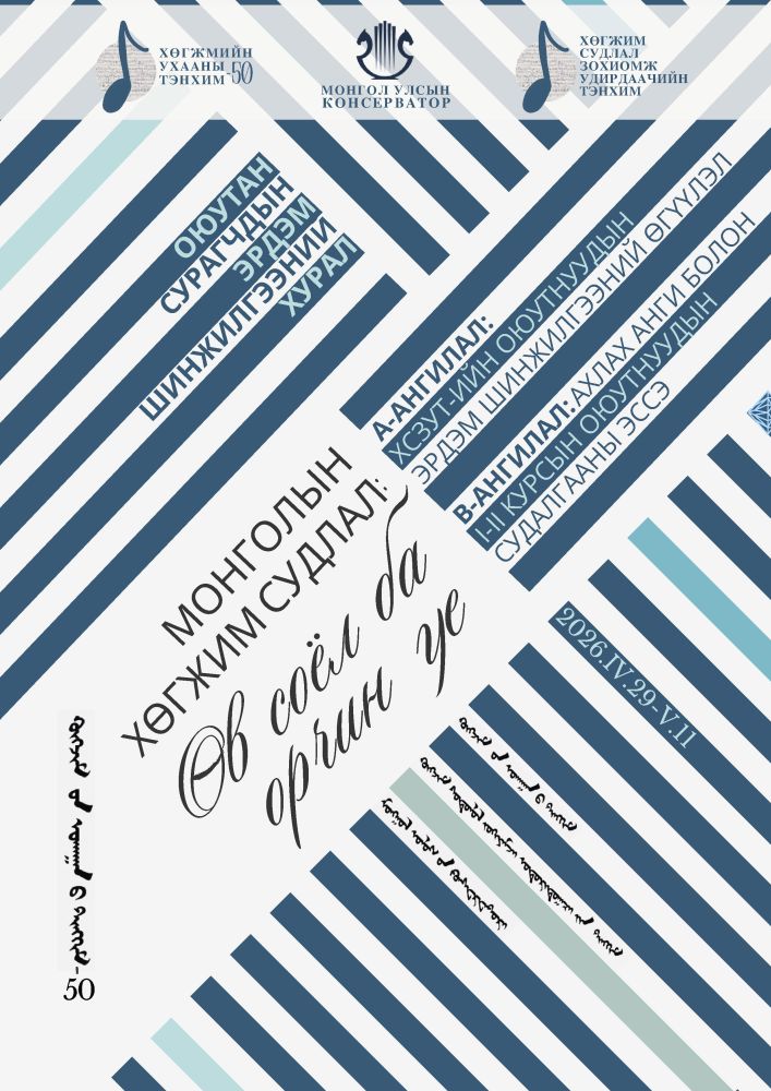 Монгол Улсын Консерваторын ХСЗУТ, ХУТ-ийн 50 жилийн ойг тохиолдуулан “Монголын хөгжим судлал: Өв соёл ба орчин үе” эрдэм шинжилгээний хурал 2026.04.29 – 2026.05.11 зохион байгуулагдана.