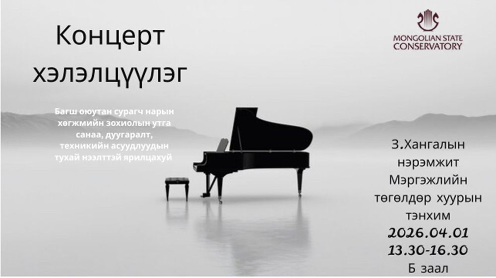 З.Хангалын нэрэмжит мэргэжлийн төгөлдөр хуурын тэнхимээс зохион байгуулсан Концерт–хэлэлцүүлэг 2026 оны 4 сарын 1-ний өдөр Концертын Б танхимд амжилттай болж өндөрлөлөө.
