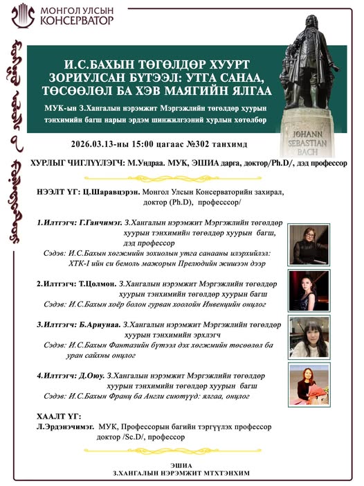 “И.С.БАХЫН ТӨГӨЛДӨР ХУУРТ ЗОРИУЛСАН БҮТЭЭЛ: УТГА САНАА, ТӨСӨӨЛӨЛ БА ХЭВ МАЯГИЙН ЯЛГАА” сэдэвт МУК-ын З.Хангалын нэрэмжит Мэргэжлийн төгөлдөр хуурын тэнхимийн багш нарын эрдэм шинжилгээний хуралд хүрэлцэн ирэхийг урьж бна.