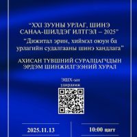 “ШИНЭ САНАА, ШИЛДЭГ ИЛТГЭЛ 2025-ДИЖИТАЛ ЭРИН, ХИЙМЭЛ ОЮУН БА УРЛАГИЙН СУДАЛГААНЫ ШИНЖ ХАНДЛАГА” Монголын их дээд сургуулийн ахисан түвшний суралцагчдын дунд зохион байгуулагдсан эрдэм шинжилгээний хурал 2025 оны 11 дүгээр сарын 14-ний өдөр Монгол Улсын Консерватор, МНШУА –ий