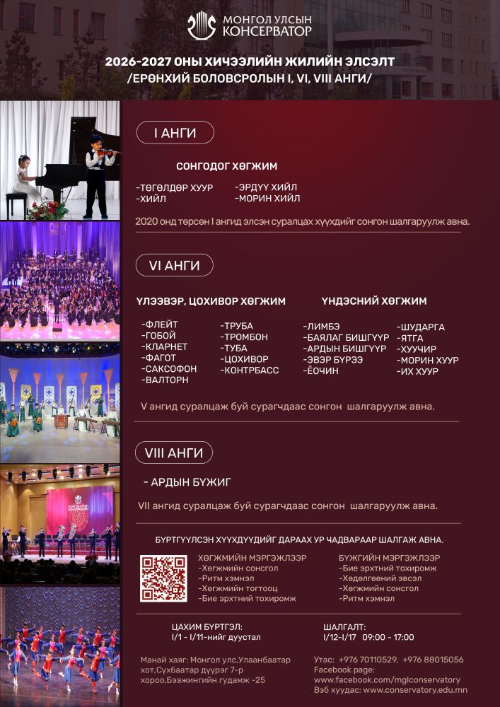 - Монгол улсын Консерваторийн ЕБС-ийн 1-р ангид – Сонгодог хөгжим /төгөлдөр хуур, чавхдаст хөгжим/, 6-р анги – Үндэсний хөгжим /нумт, товшвор, үндэсний үлээвэр/, – Үлээвэр цохивор хөгжим, – Сонгодог бүжиг, 8-р ангид Бүжиг /ардын бүжиг/, Циркийн жүжигчний мэргэжлээр тус тус элсэлт авна.