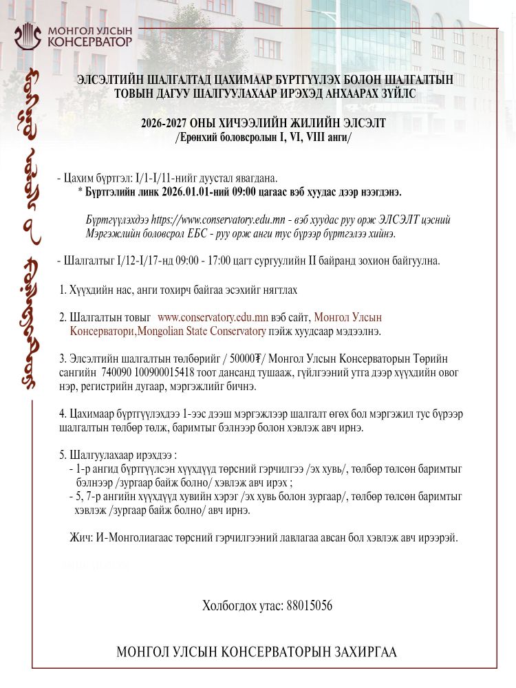 - Монгол улсын Консерваторын захирлын тушаалаар элсэлтийн хяналтын тоог батална.